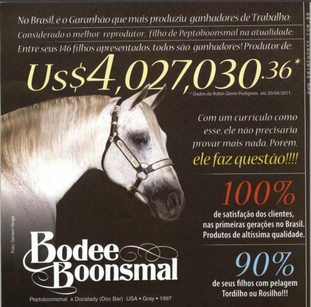 Seu pai BODEE BOONSMAL, Importado. é um dos maiores produtores de Trabalho a entrar no Brasil, tendo seus filhos ganhos de mais de U$ 4,3 milhões, em Apartação, Laço, WCH, Redeas, Ranch Sorting e Team Penning entre eles: MH BODEES STARLENA, U$ 335,545, MH BIJOUS BODEE, U$ 245 mil, MH MILLIONDOLLARBILL, U$ 189.209,00. No Brasil seus filhos já ganharam e já produziram vários campeões em Apartação, Laço, Laço Comprido, Team Penning e Ranch Sorting, tendo seus filhos R$ 91.544,46 de ganhos e 129 pts pela ANCA e 1.438 pts pela ABQM, entre eles: