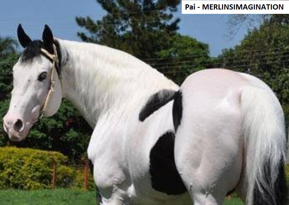 Seu pai MERLINSIMAGINATION, Importado, possui um pedigree indiscutível. Importado, com inúmeros filhos no Brasil; Produtor comprovado; transmite sua genética, sua cor e conformação a todos os seus produtos; Pintura inigualável, musculatura excelente; Irmão do garanhão da Paint Collection TM B LINES BESTINBLACK; Linhagem trabalho x corrida; produziu inúmeros animais preto e branco, toveros, inclusive em éguas sólidas. Foi importado por criador renomado da raça, seus filhos sempre são recorde de leilão, atingindo preços altíssimos para a raça. seu irmão TM B LINESBESTINBLACK, também importado. Trazido pela Paint Collection é homozigoto e tem linhagem de trabalho, que produziu no Brasil, em sua primeira geração destaque para: SHOWHORSE INBLACK TH. (Grande Campeão V Congresso ABC Paint/2004 Conformação Aberta; Reservado Grande Campeão V Congresso ABC Paint/2004 – Amador, 1º Lugar II Etapa IX Campeonato Nacional ABC Paint/2004 – Aberta e Amador, 1º Lugar IV Etapa do IV Campeonato Nacional ANC Paint/2004 Aberta e Amador, 2º Lugar V Etapa IX Campeonato Nacional ABC Paint/2004-Aberta e Amador).