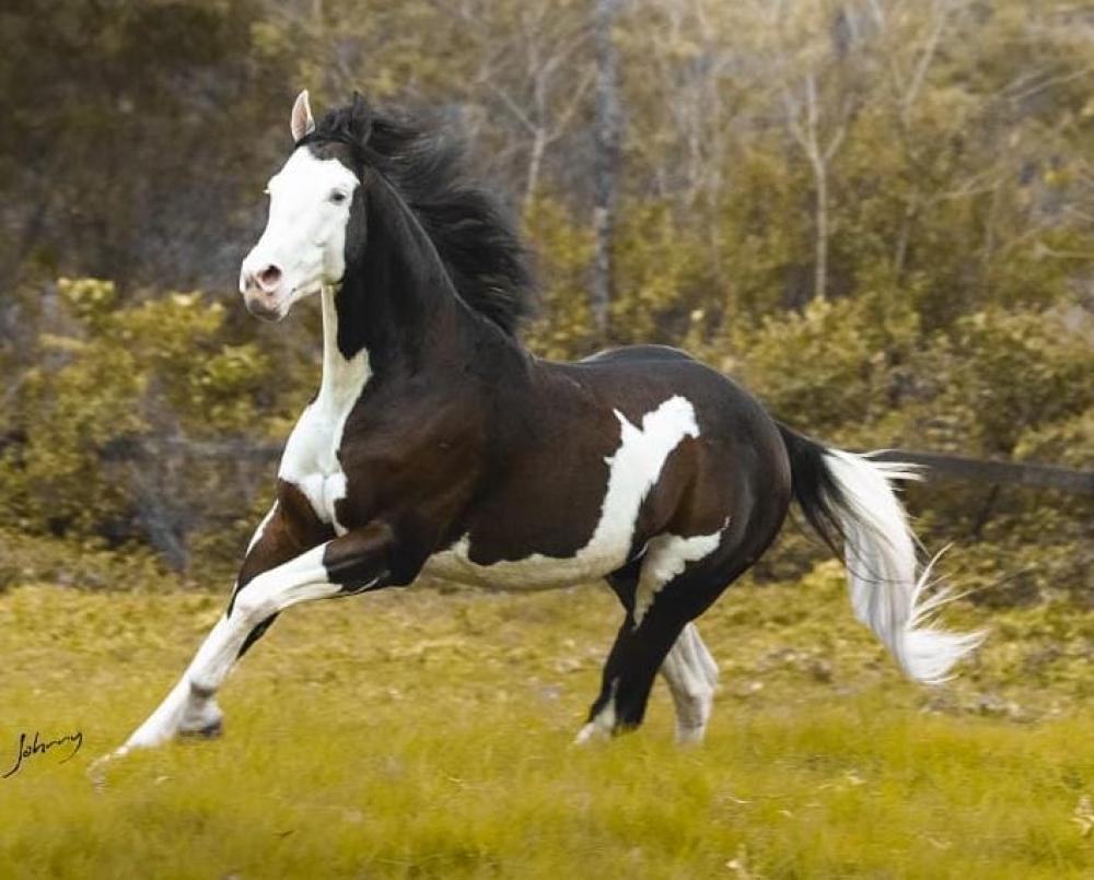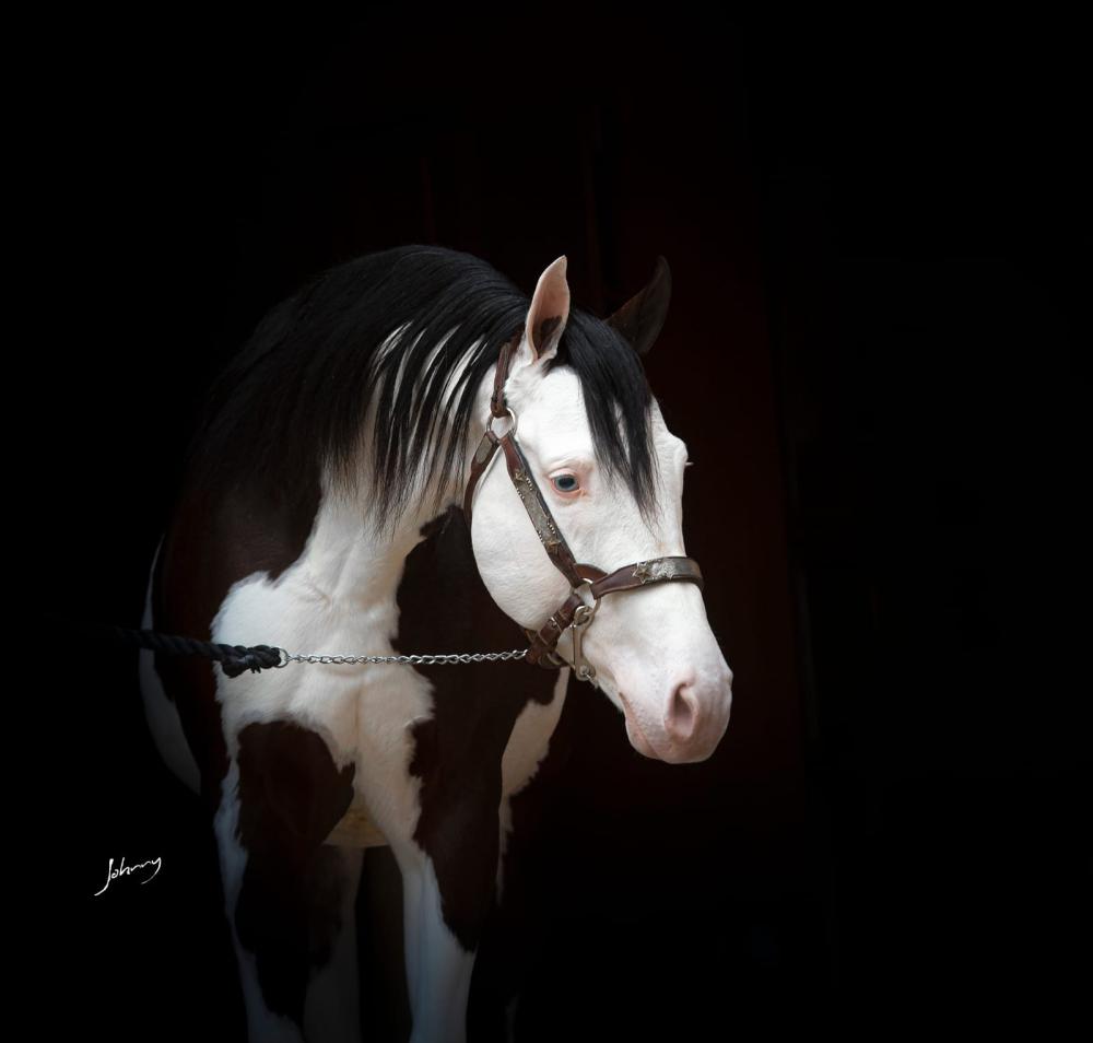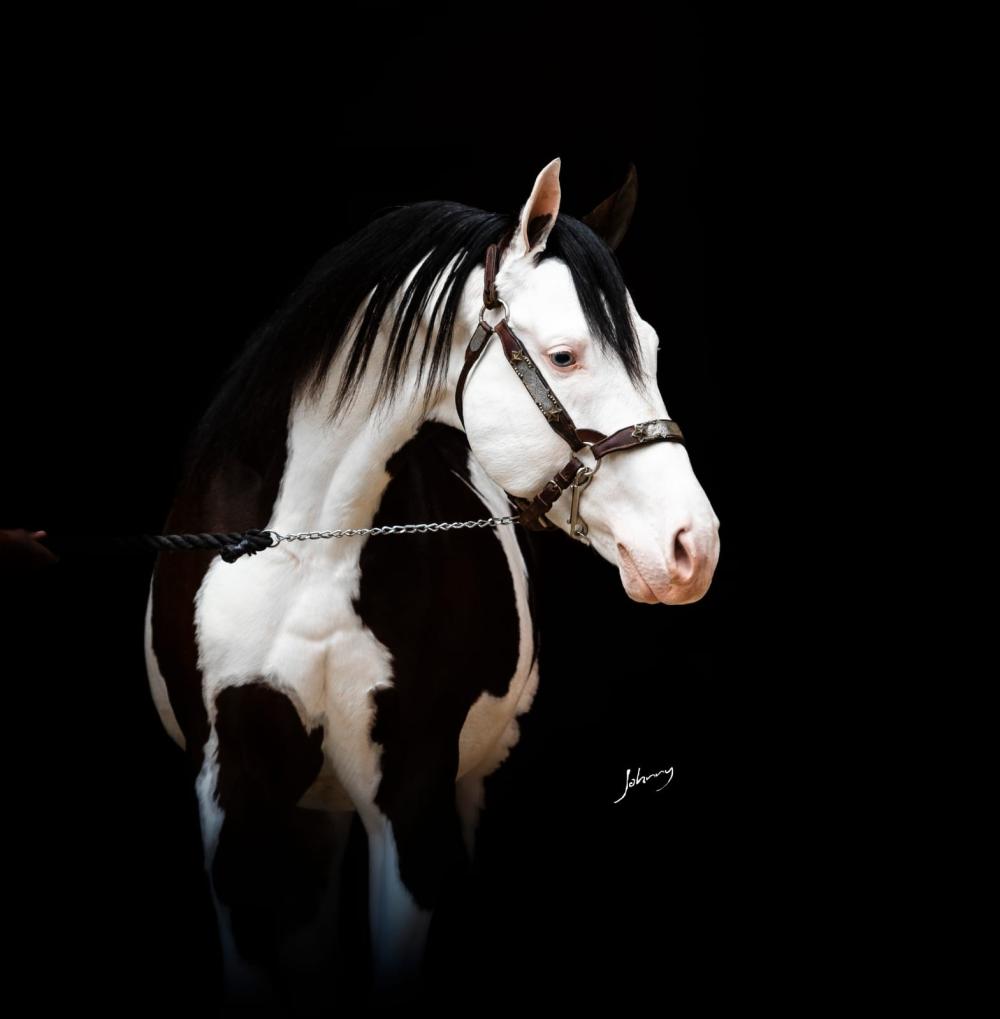 - Garanhão Quarto de Milha Homozigoto para Splash Sw1/Sw1 (todos os filhos nascem com o gen Splash)